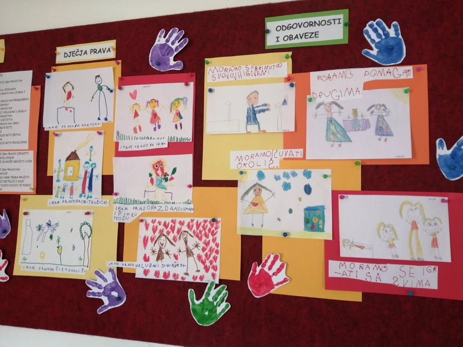 Kroz igru, čitajući slikovnice te gledajući kratke filmove na temu prava i dužnosti, upoznali smo djecu s njihovim pravima i dužnostima i naučili ih da imaju pravo tražiti ostvarenje svojih i tuđih prava. Djeca su shvatila da ostvarivanje određenog prava zahtijeva određenu odgovornost ili obavezu. Razgovarali smo o obavezama za koje se očekuju od djece da ih mogu izvršiti: brinuti se o svojoj higijeni, slušati drugoga, lijepo se ponašati, brinuti se o drugima te pomagati, čuvati prirodu i okoliš... Nakon razgovora djeca su se likovno izrazila na zadanu temu.