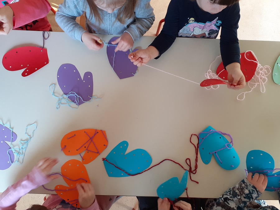 Kako bi naše lutkice bile spremne za izlazak van na igru, šivali smo kape i rukavice. Pri tome su djeca razvijala upornost i strpljivost te razvijali finu motoriku ruku.