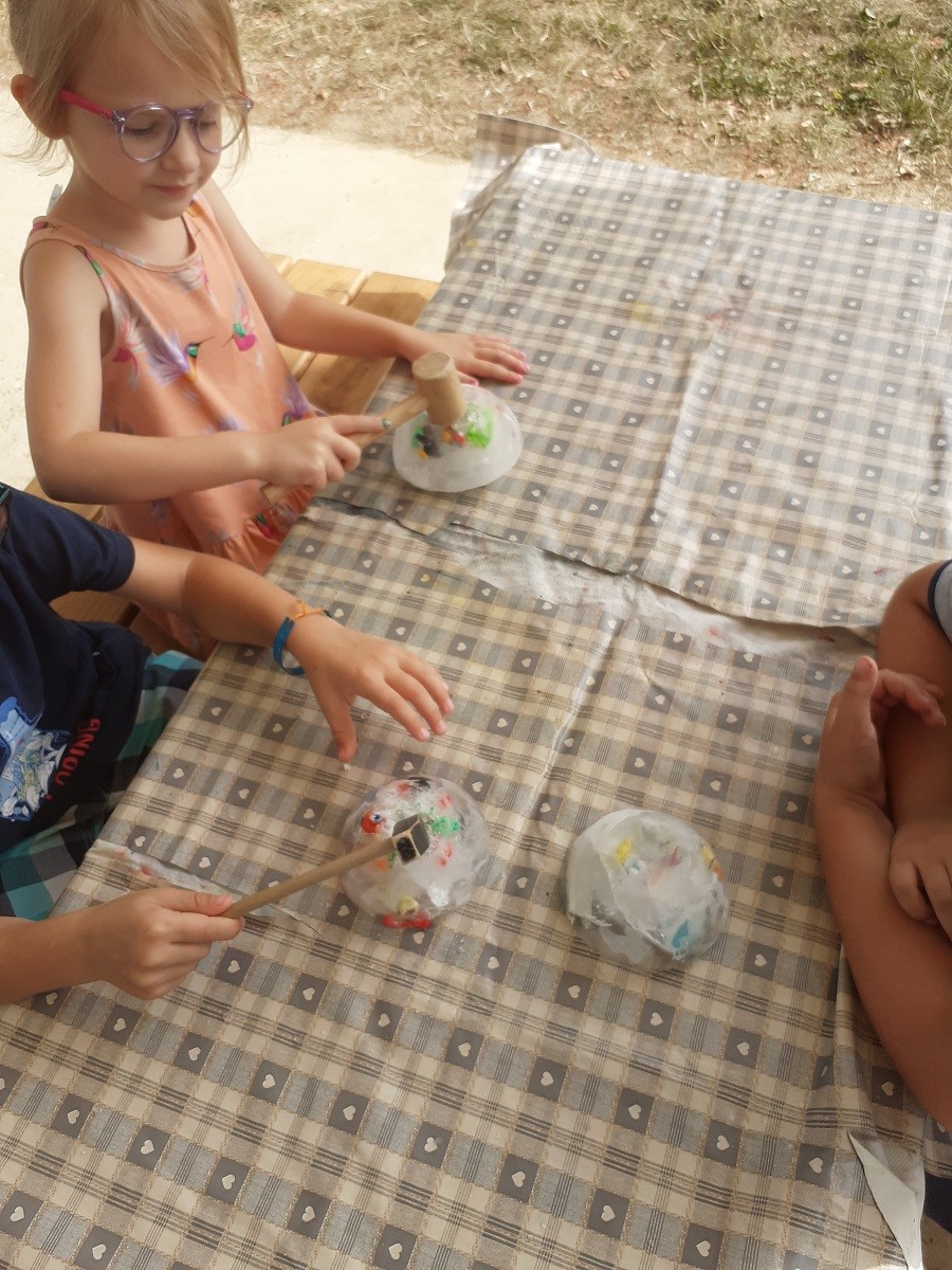 „Zaleđene igračke“ – sitne igračke stavili smo u posude s vodom i stavili u zamrzivač preko noći. Djeci su bili ponuđeni čekići i prilika da se probiju do svoje nagrade koja je okovana ledom. Uz puno pažnje, strpljenja, međusobnog dogovaranja, čekanja na red svako dijete dobilo je priliku da uloženim trudom i naporom dođe do željene igračke.
