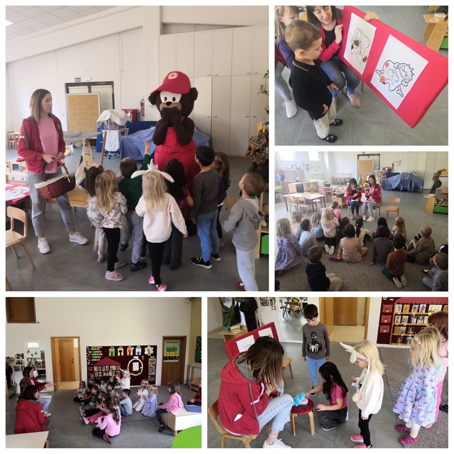 Ugostili smo gospođu Pukec iz Crvenog križa, koja nas je zajedno sa svojim kolegicama , Martinom i Ivanom, kroz zabavne igre i aktivnosti poučila o pranju ruku, brizi za zube i važnosti zdrave prehrane. Razveselio nas je i Medo koji nam je uz lizaljke podijelio i pregršt zagrljaja.